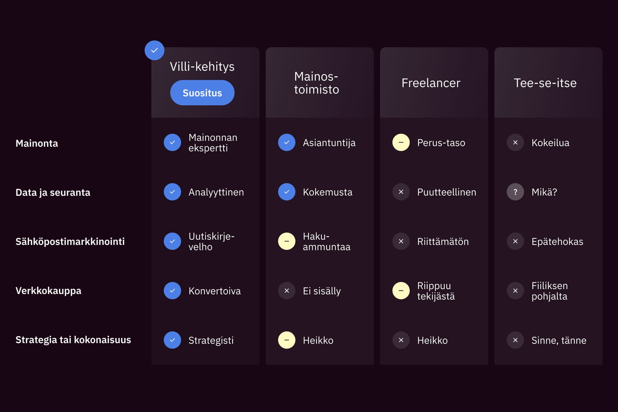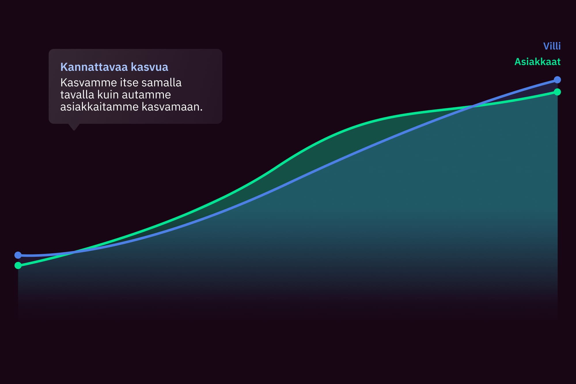 Villi on yksityisomisteinen, kannattava ja vakavarainen toimija. Kasvamme itse samalla tavalla kuin autamme asiakkaitamme kasvamaan — tekemällä oikeita asioita kannattavasti. Uskomme, että yritys joka ei saa omaa liiketoimintaansa kukoistamaan ei pysty tekemään sitä sinullekaan.
